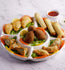 Kibbeh, Lamb kibbeh, vegetables spring roll, spinach sambusek, cheese sambusek and meat sambusek, garnish with lettuce, tomato and slice lemon and serves with dip on the side.