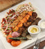 Shugaf, shishtawoq, lamb kofta, chicken kebab with garlic sauce, French Fries, grilled chili, tomato and onion.Served with freshly baked bread
